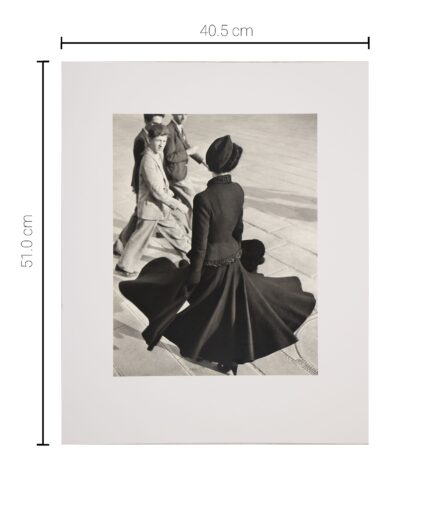 1947 – 黒いロングドレスに帽子姿の女性が通りを歩いている。