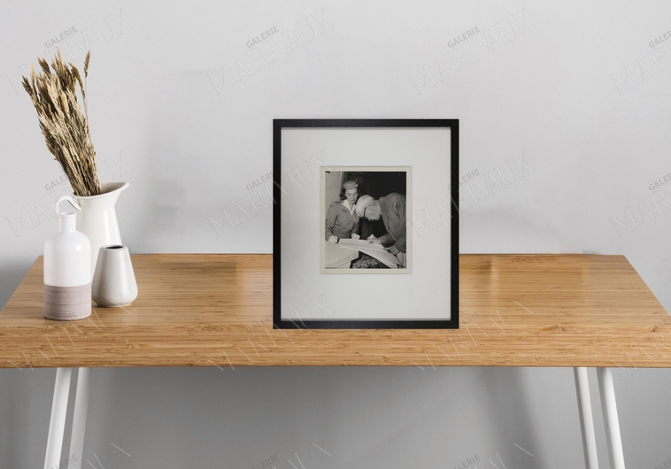 Andre Micheau was a well-known French photographer active in the mid-20th century, recognized for his fashion and personality photos. His work includes capturing significant cultural figures of his time, such as artists signing works atop books by Bernard Buffet, with scenes often featuring notable backgrounds or companions suggesting their professions or societal roles. For instance, one of his photographs showcases the artist Tsuguharu Foujita dedicating a work, with elements in the image hinting at an air hostess' presence, suggesting a blend of artistic and everyday life moments captured through his lens​​. Micheau's ability to document the essence of the 20th-century cultural landscape, combined with his talent for fashion photography, positioned him as a significant figure in capturing and portraying the zeitgeist of his era through photography. His works are appreciated not only for their historical value but also for their artistic quality, offering a window into the lives and environments of mid-20th-century personalities and fashion.