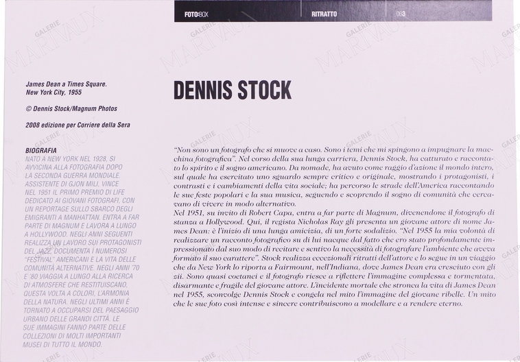 Dennis Stock (1928–2010) was an American photographer best known for his intimate and evocative portraits of Hollywood icons, jazz musicians, and scenes of American life. His work is celebrated for its candidness, depth, and the unique insight it provides into the personalities and atmospheres he captured. Stock was a member of Magnum Photos, a prestigious international photographers' cooperative, indicating his significant standing in the world of photojournalism and art photography. One of Stock's most iconic images is a portrait of James Dean walking in Times Square, New York, in 1955, encapsulating the actor's vulnerability and the transient nature of fame. This photo is part of a larger series that Stock took of Dean just before he became a superstar, offering an intimate glimpse into the actor's life and becoming emblematic of Dean's enduring legacy. Beyond celebrity portraiture, Stock had a keen eye for the American landscape and culture. His work includes powerful depictions of the jazz scene, featuring legends like Billie Holiday and Louis Armstrong, and explores themes of Americanness, from the vastness of its landscapes to the idiosyncrasies of its social rituals. His photographs of the California hippie movement, the landscapes of the American West, and everyday life scenes are notable for their composition, empathy, and ability to capture the essence of a moment. Stock's approach to photography was characterized by a deep desire to understand and convey the inner life of his subjects, whether they were famous personalities or ordinary Americans. His images are more than just snapshots; they are profound explorations of character and place, often reflective and always evocative. Throughout his career, Dennis Stock authored several books of photography and was the recipient of numerous awards. His work has been exhibited widely and continues to be featured in major publications and collections around the world, testament to his skill in capturing moments that resonate with universal human experiences.