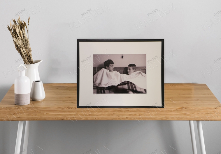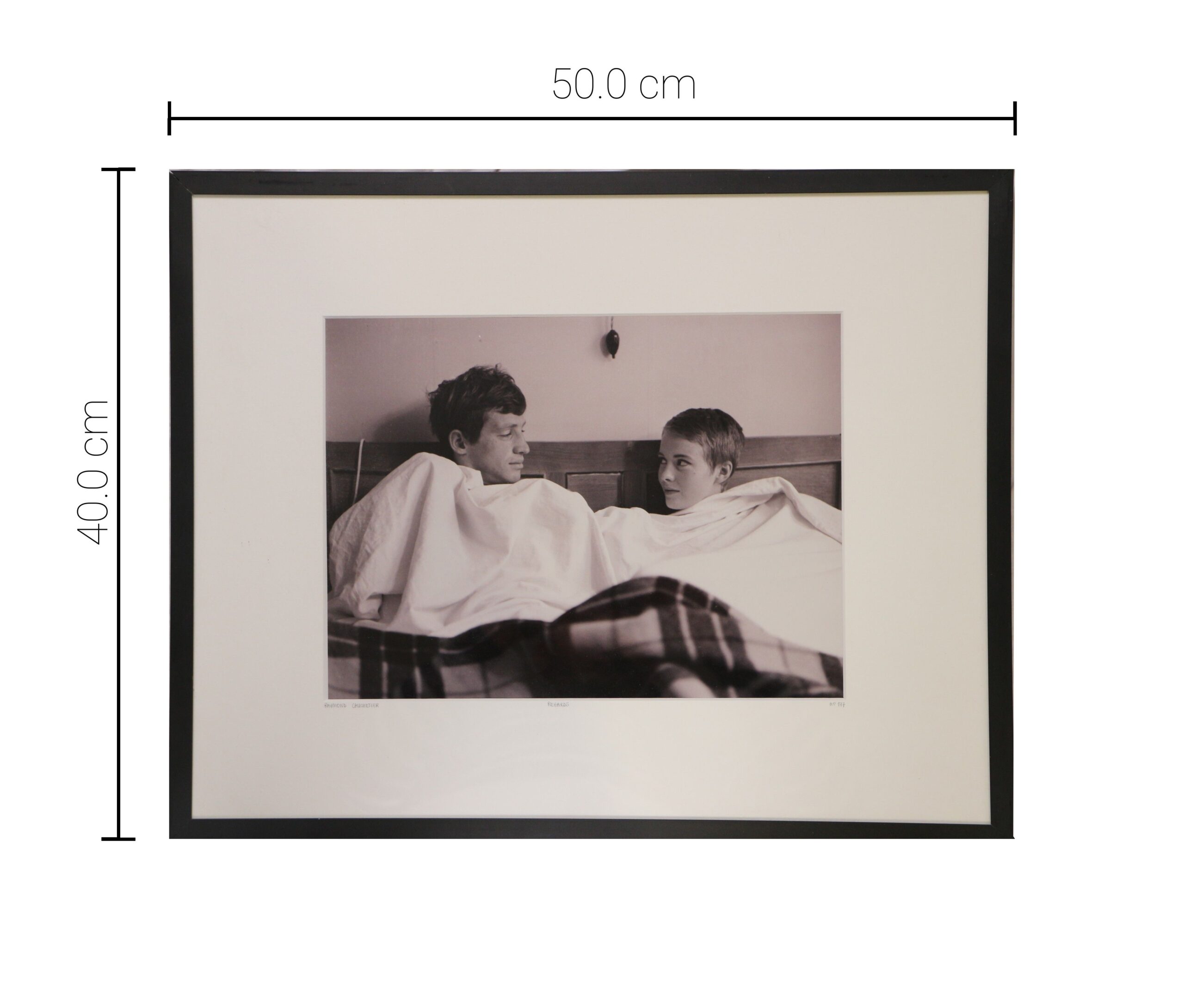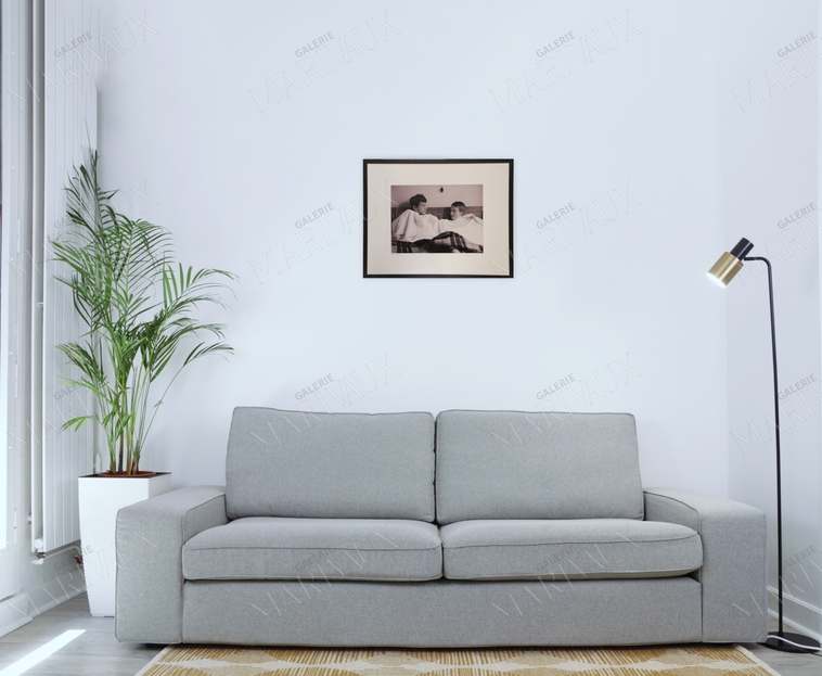 この画像は映画『Bout de Souffle』(直訳すると「息もできない」)のセットで撮影されたもので、ベッドに横たわる2人の優しい瞬間をとらえている。2人とも白いシーツを着ており、このシーンに無邪気さと純粋さを添えている。