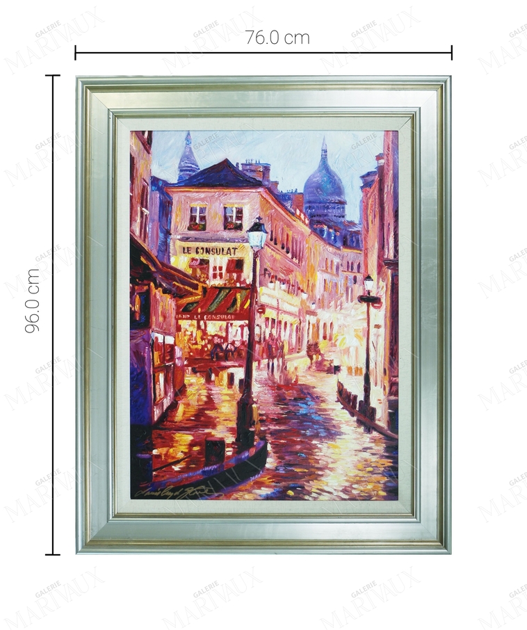 濡れた道に反射する光の戯れに注目。最近降った雨が、空の色合いの変化を映し出している。この要素は、パリの夜の本質をとらえる画家の特徴的なモチーフである、このシーンのロマンチックな魅力をさらに高めている。