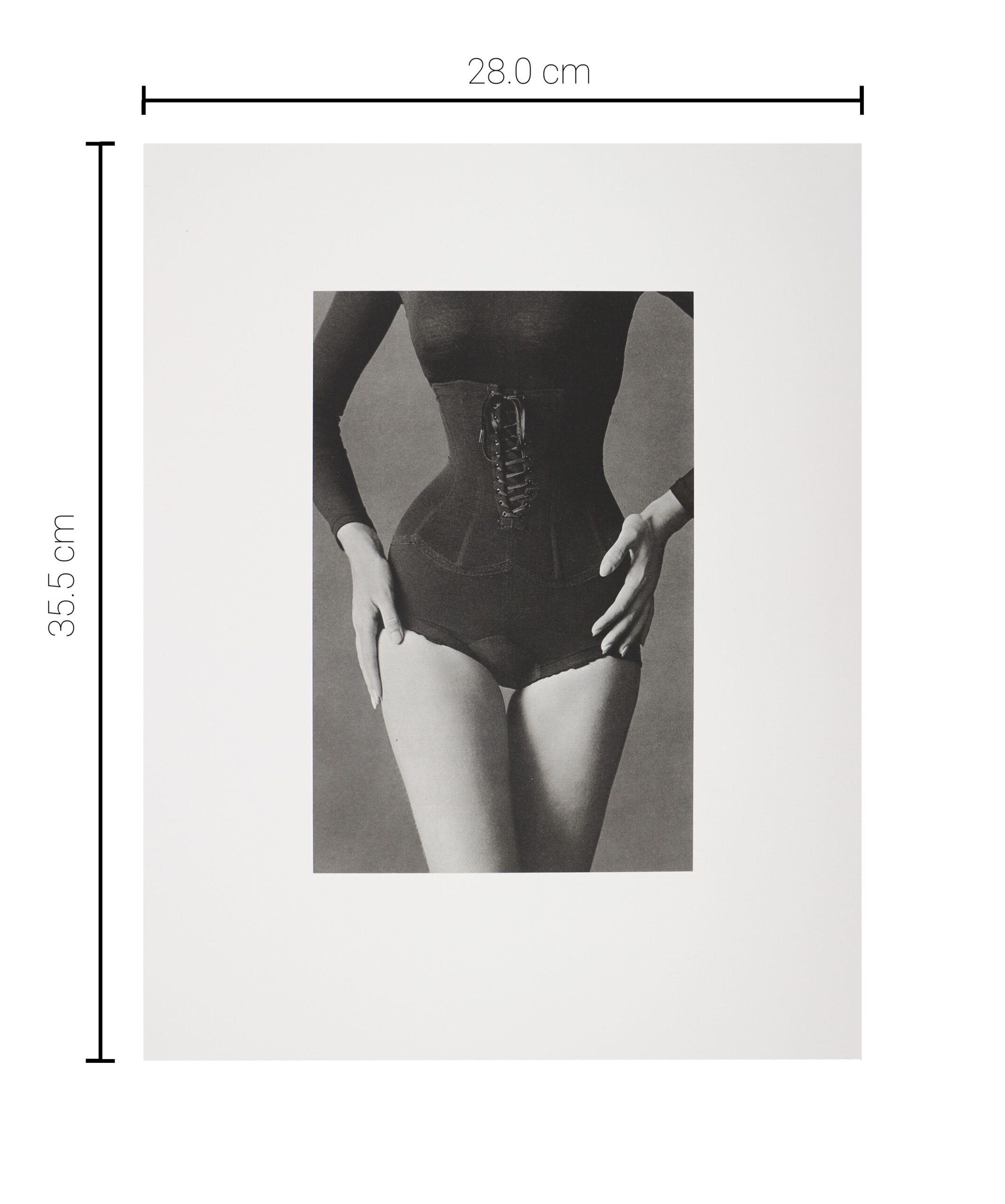 1979 – コルセットを着用し、腰に手を当てる女性。