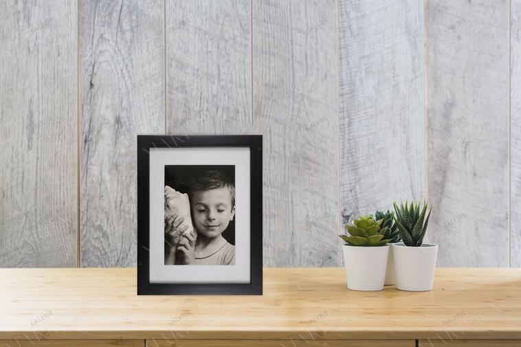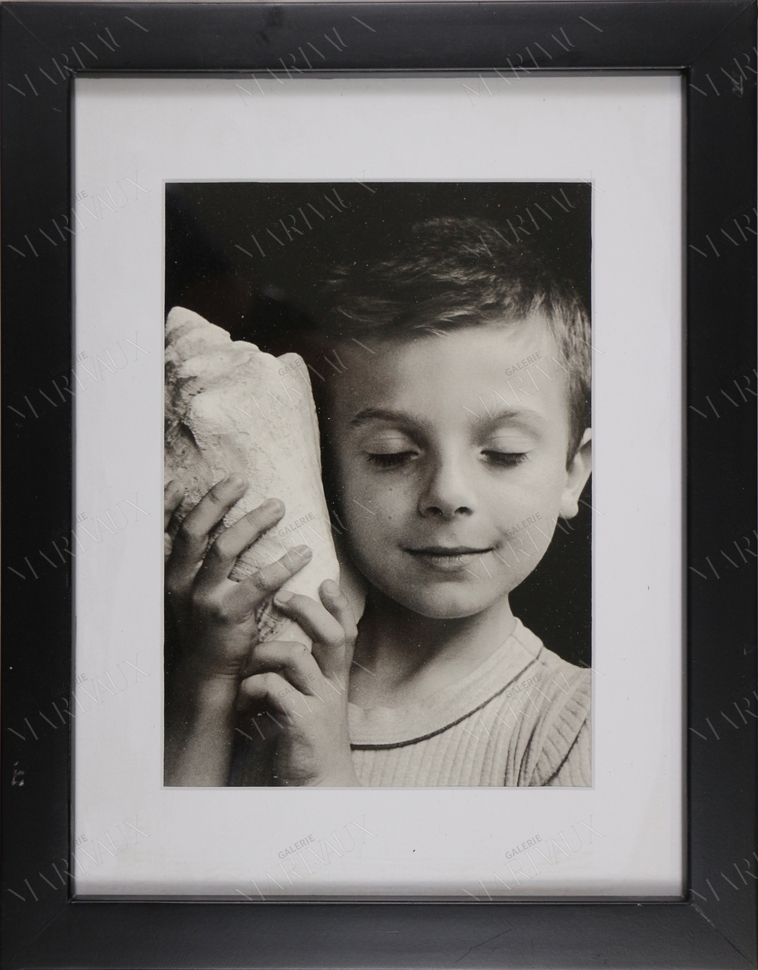 The image captures a young boy with a smile on his face, holding a large shell to his ear. The boy appears to be enjoying the moment, possibly pretending to listen to the shell as if it were a phone. The scene is set against a black background, which draws attention to the boy and the shell. The boy’s expression and the playful act of holding the shell to his ear create a sense of joy and innocence in the image.