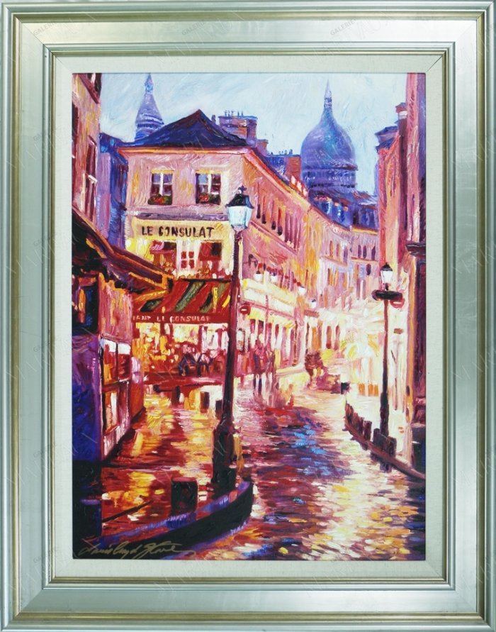 Notice the play of light reflecting on the wet street, suggesting a recent passing rain that now mirrors the sky’s changing hues. This element adds to the scene’s romantic allure, a signature motif for an artist capturing the essence of Parisian nights.