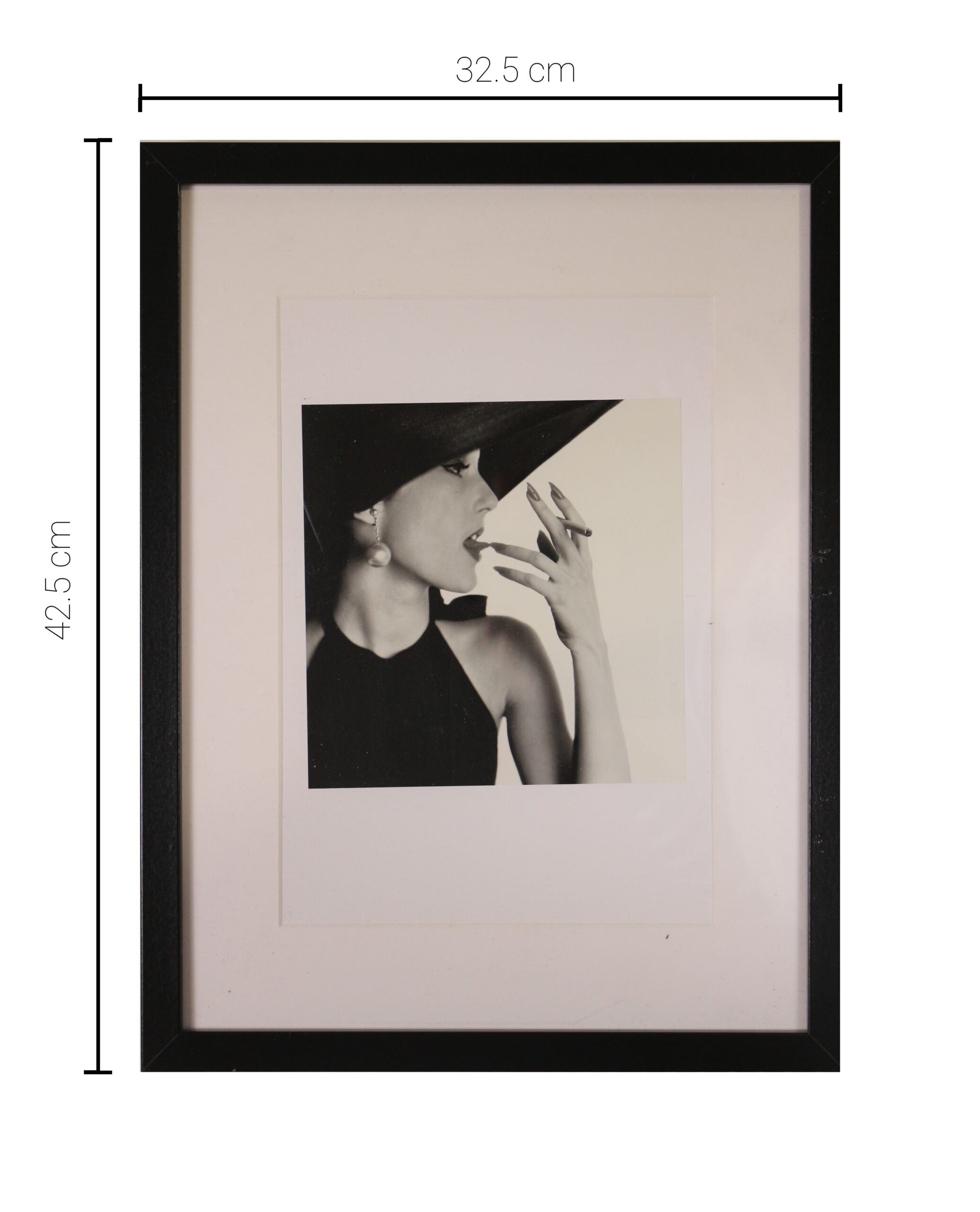 The image captures a captivating moment of a woman wearing a black hat and a black dress, as she leans forward and smokes a cigarette. The woman’s gaze is directed towards the camera, creating a sense of intimacy and connection with the viewer. The black and white nature of the photograph adds a timeless and classic quality to the scene. The woman’s elegant attire and the act of smoking a cigarette evoke a sense of sophistication and a hint of mystery, inviting the viewer to ponder the story behind the image.