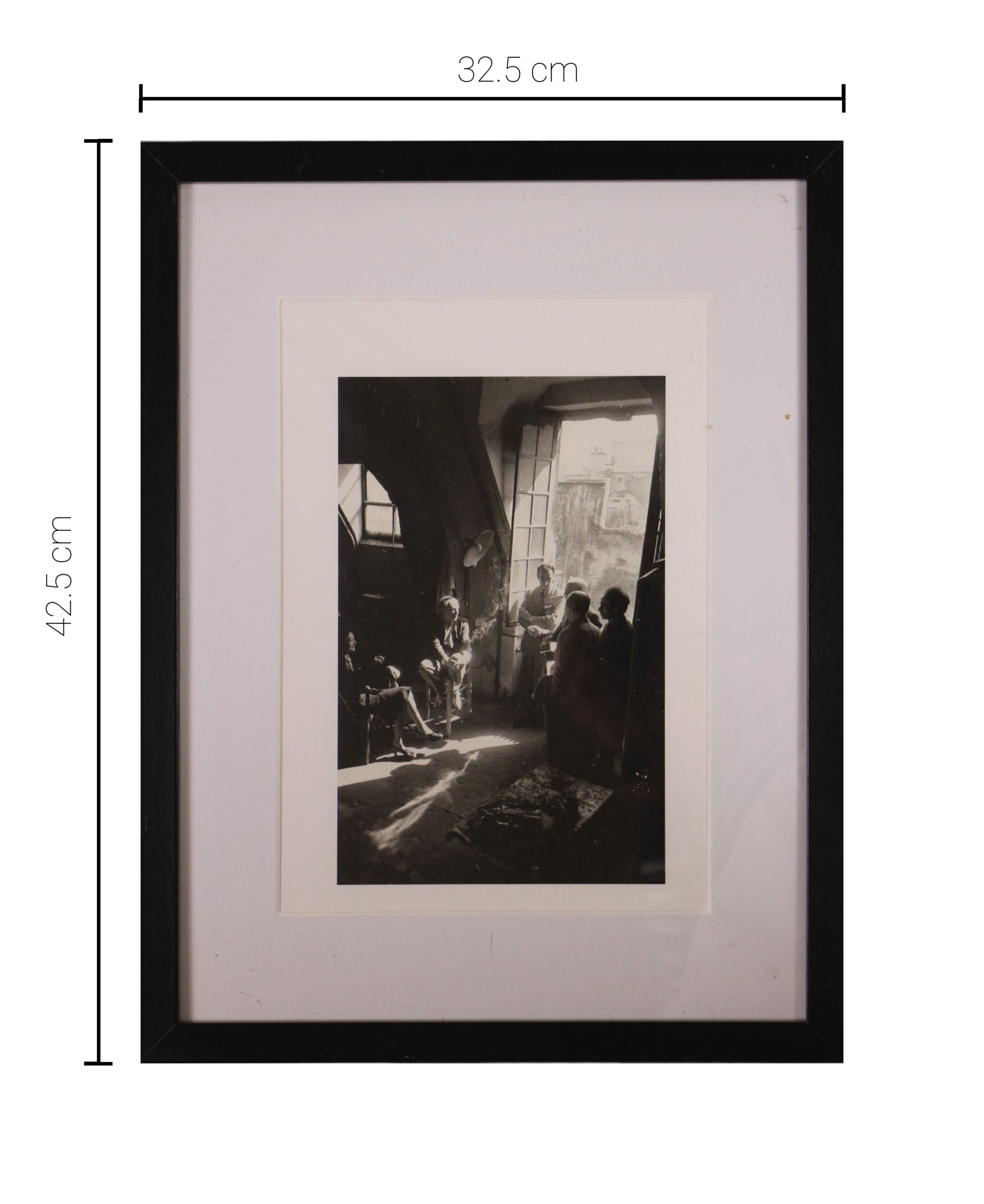 The image is a black and white photograph of a group of people gathered in a room. They are sitting on chairs, with some of them standing as well. The room appears to be a dining area, as there are multiple chairs and a dining table. The people are engaged in conversation, creating a warm and inviting atmosphere. The photograph captures the essence of a social gathering, with the individuals enjoying each other’s company in a cozy setting.