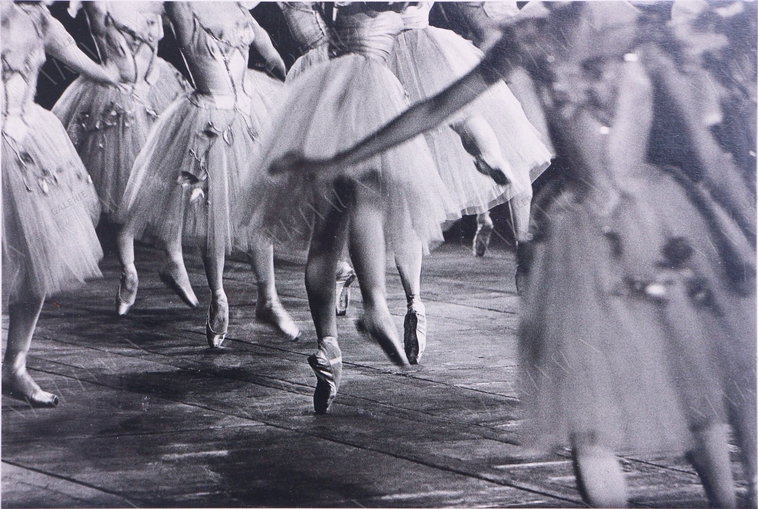 The monochrome palette of the photograph adds a timeless quality to the scene, evoking a sense of nostalgia and reverence for the art of ballet. The absence of color allows the viewer to focus on the shapes, lines, and textures within the image, from the delicate fabric of the ballerinas’ tutus to the smooth surface of the stage.