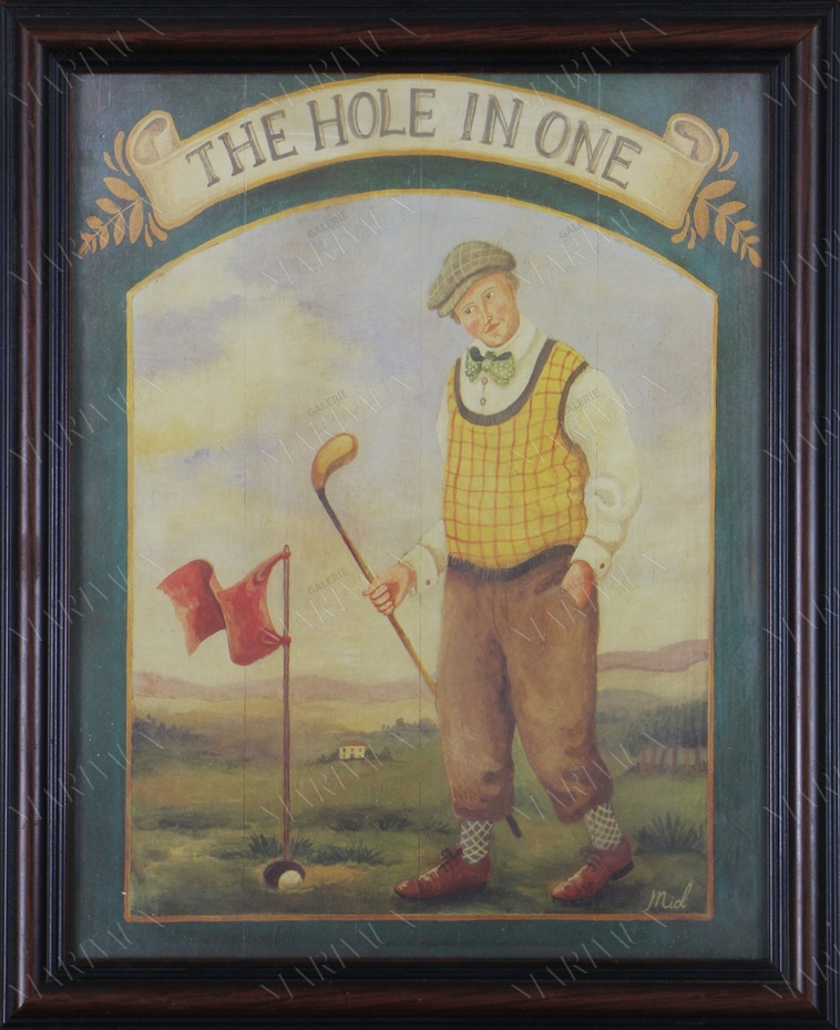 The golfer’s posture and facial expression convey a sense of satisfaction and pride. His gaze is directed towards the flag, indicating his focus on the task at hand. The overall composition of the artwork, with its vibrant colors and detailed depiction of the golfer and his surroundings, brings the viewer into the moment of victory, making it a captivating piece of art.